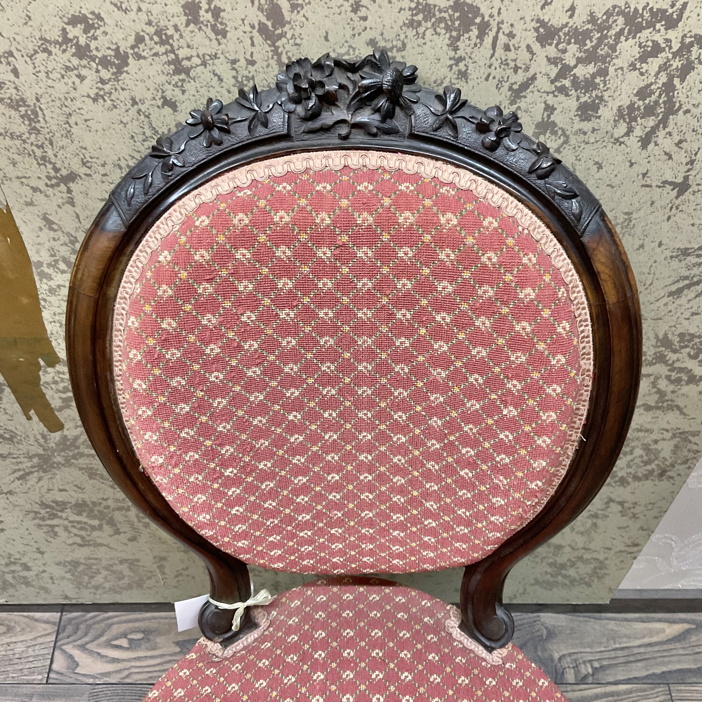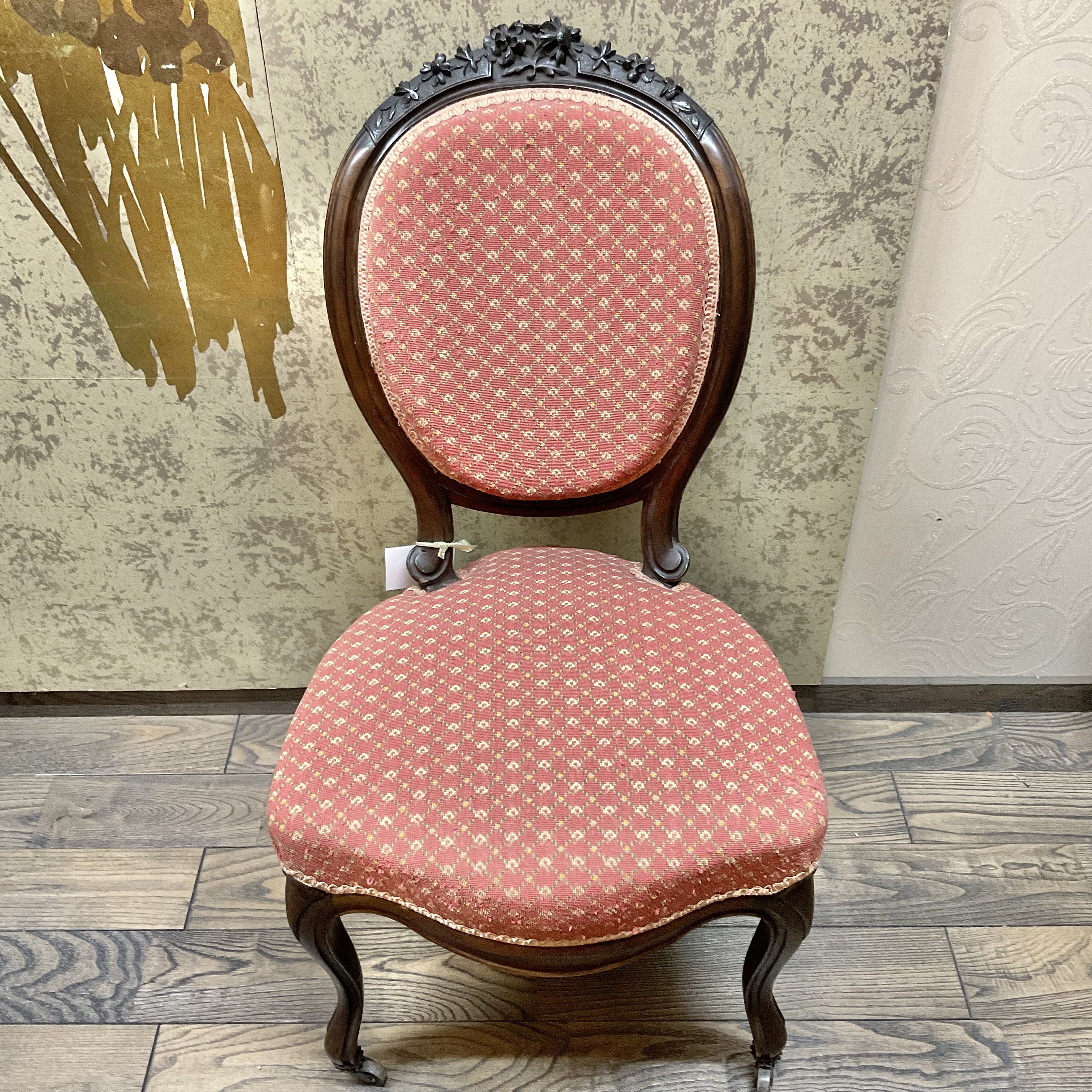 小さなお花が散りばめられた刺繍椅子。塗装・張り替え済みです。 椅子の下には小さな車輪が付いており、お部屋の中で移動させるときも便利です。