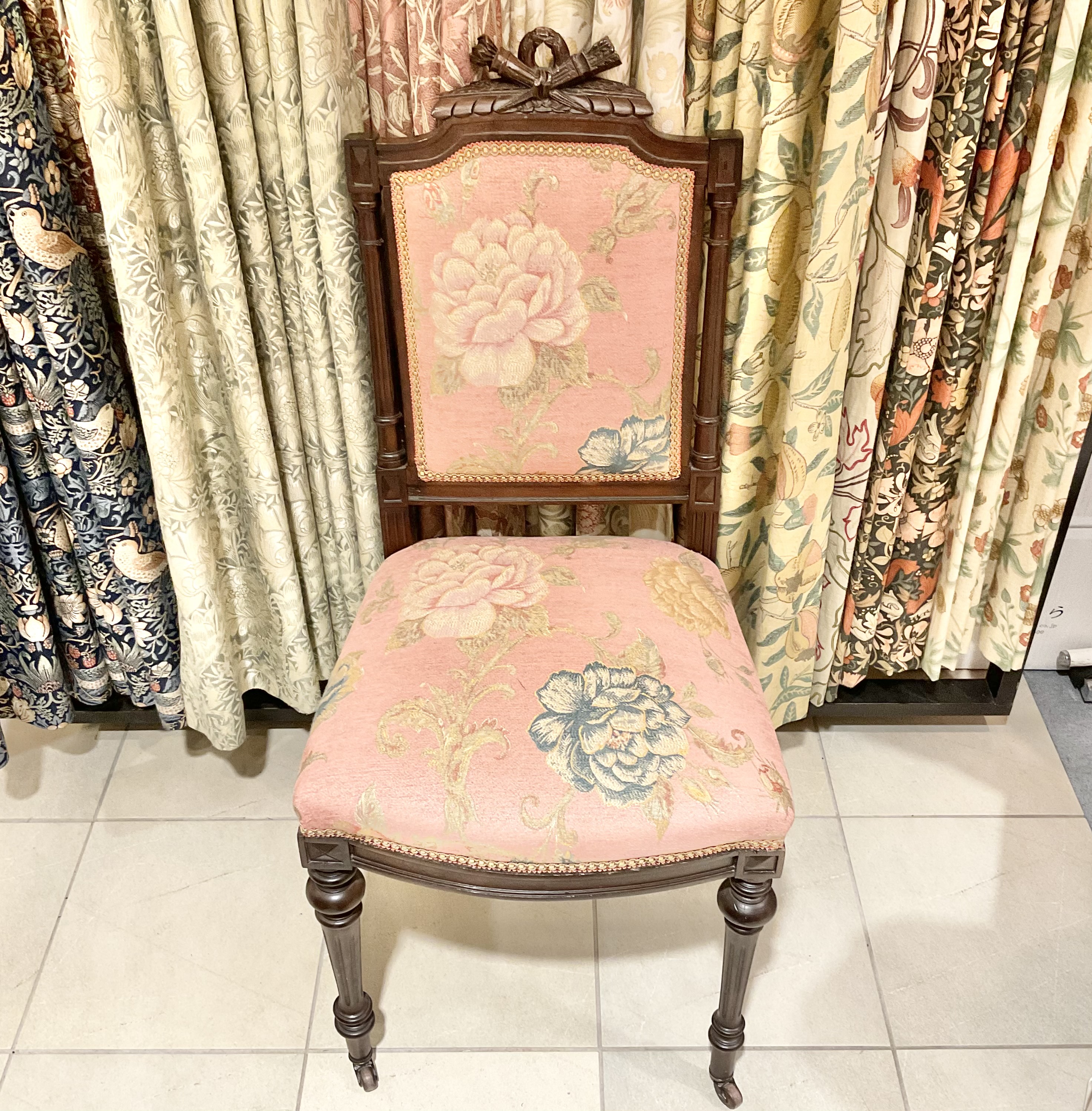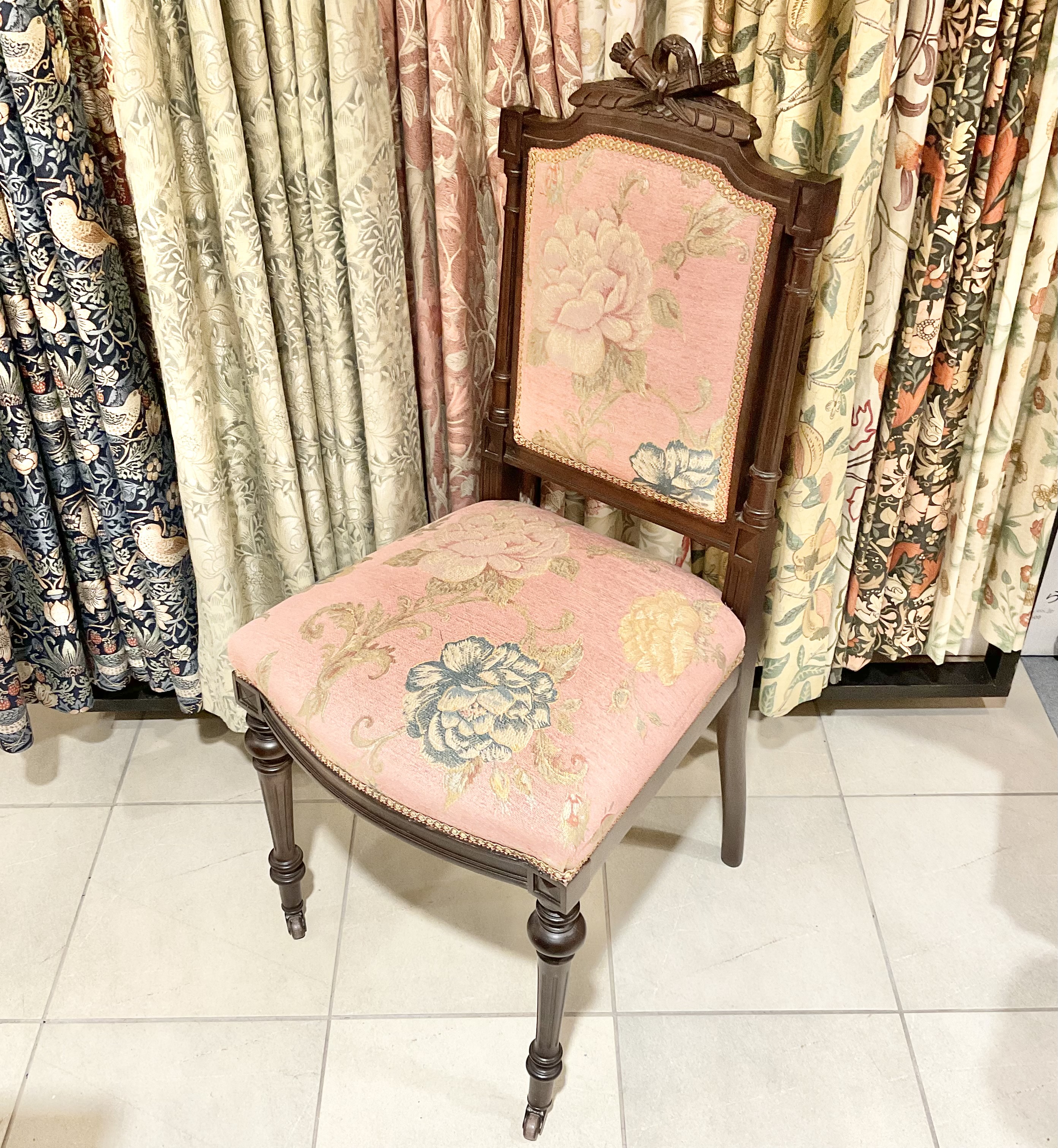 背もたれトップの彫刻がトレードマークの椅子です。