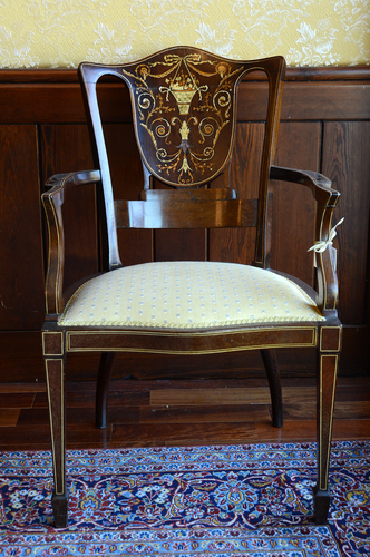 背もたれが芸術的な一品です。生地は張り替え済み。