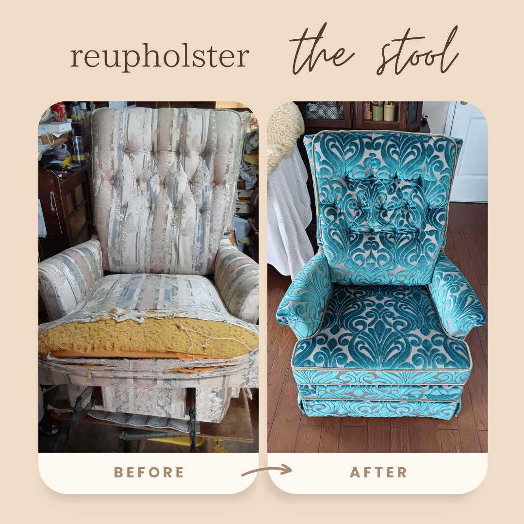 長年の使用により張地が破れ、座面の劣化も激しい状態でした。