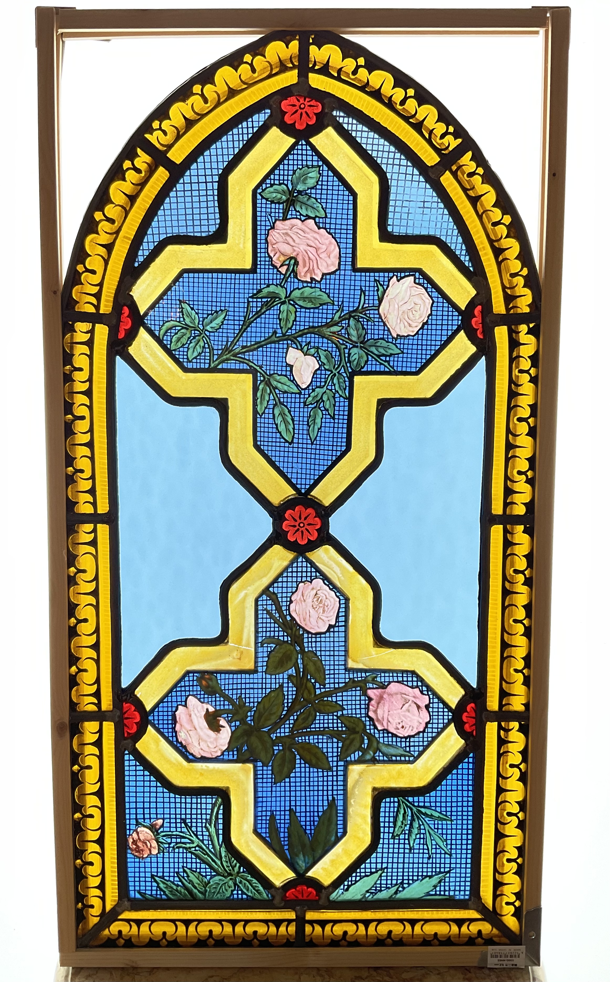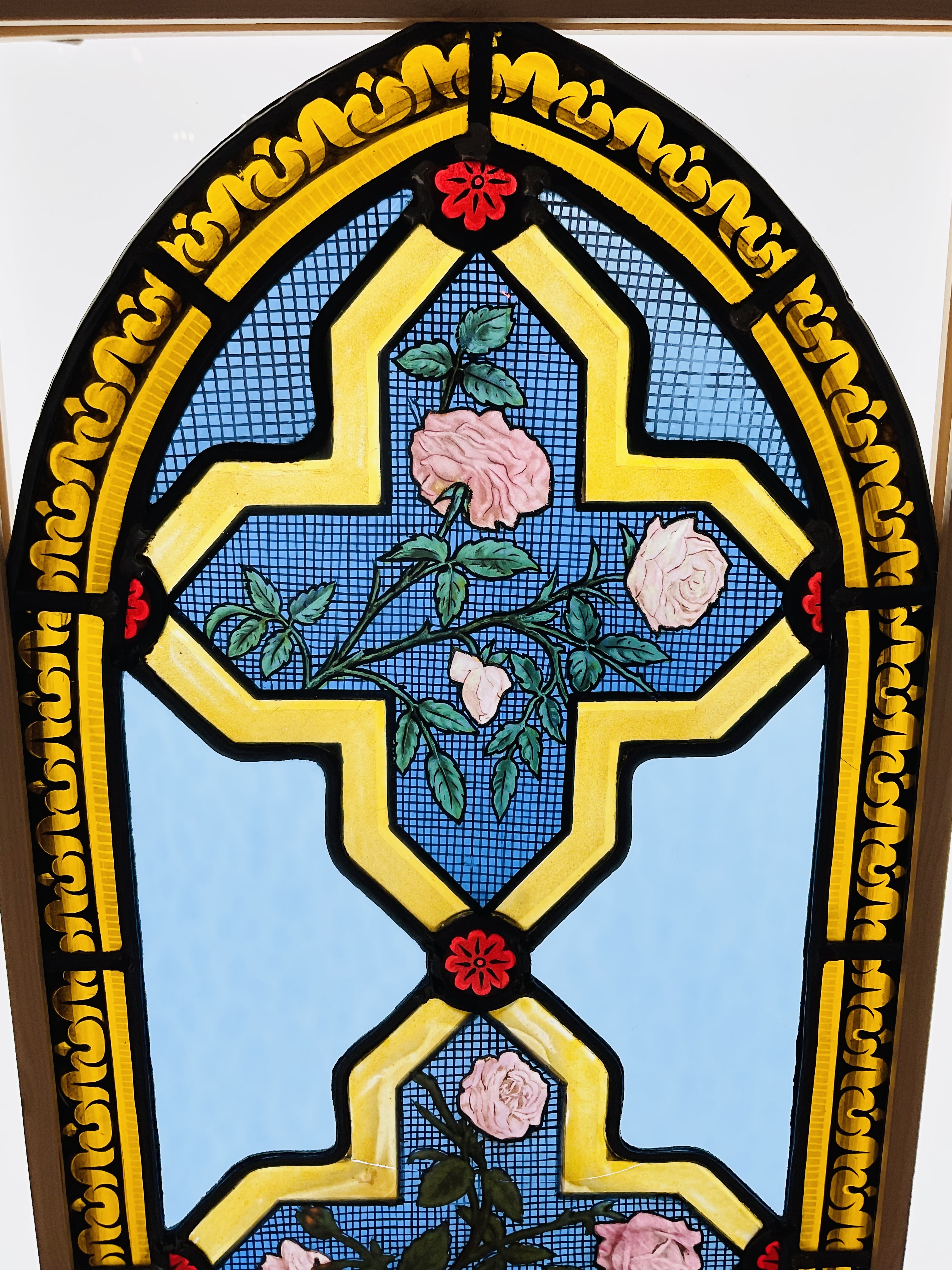 ロザリオ模様の中にバラの花が描かれています。
