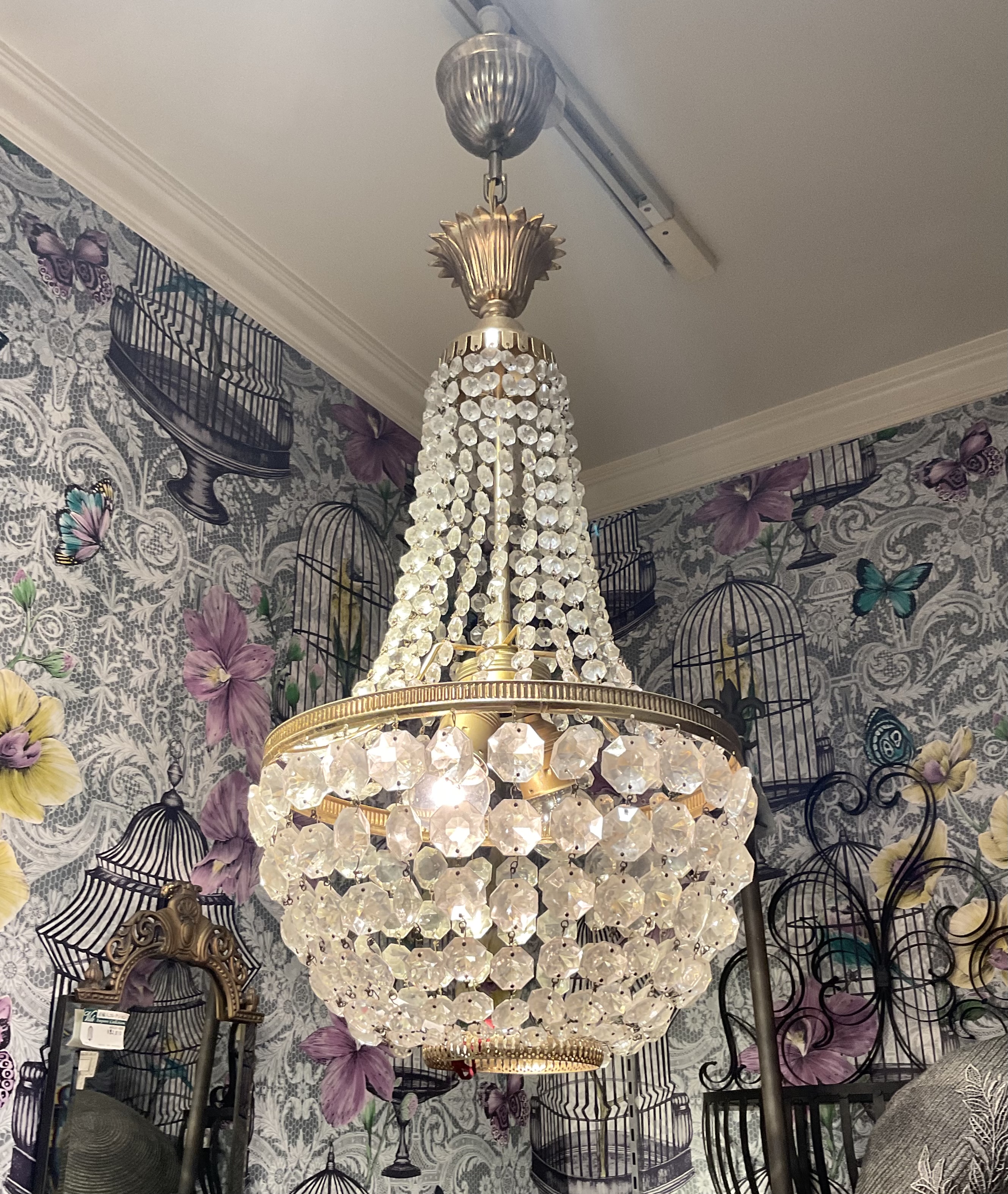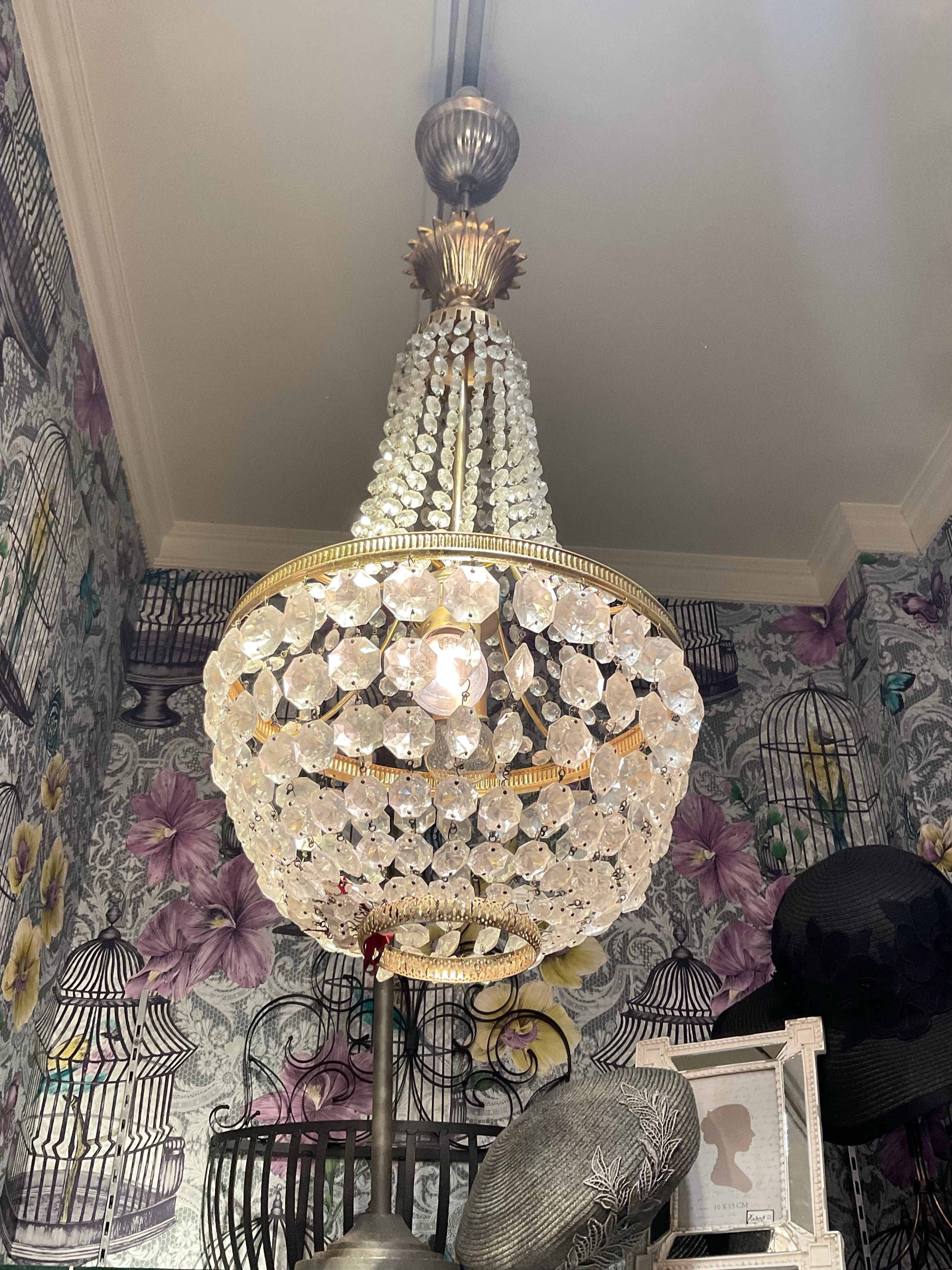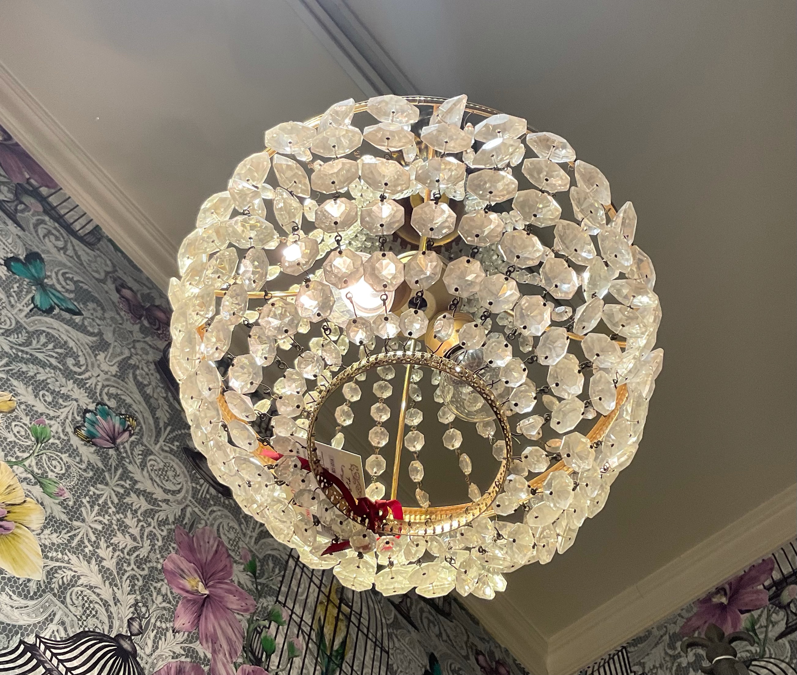 支柱部分がクリスタルで覆われた、ユニークなシャンデリアです。