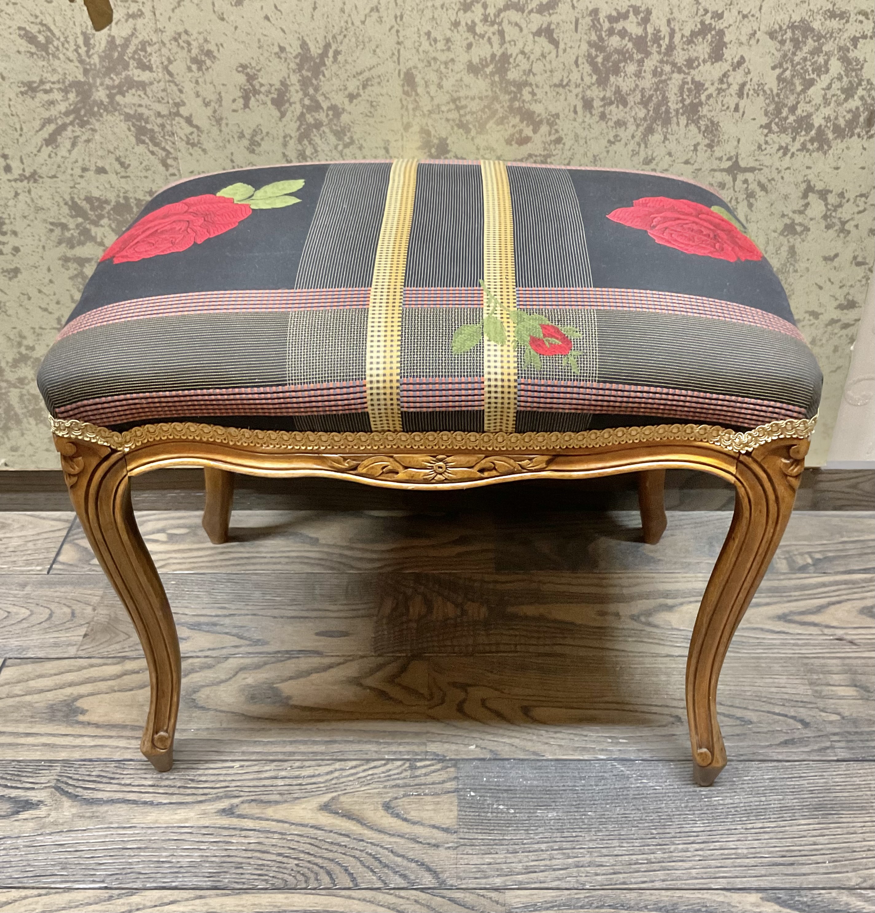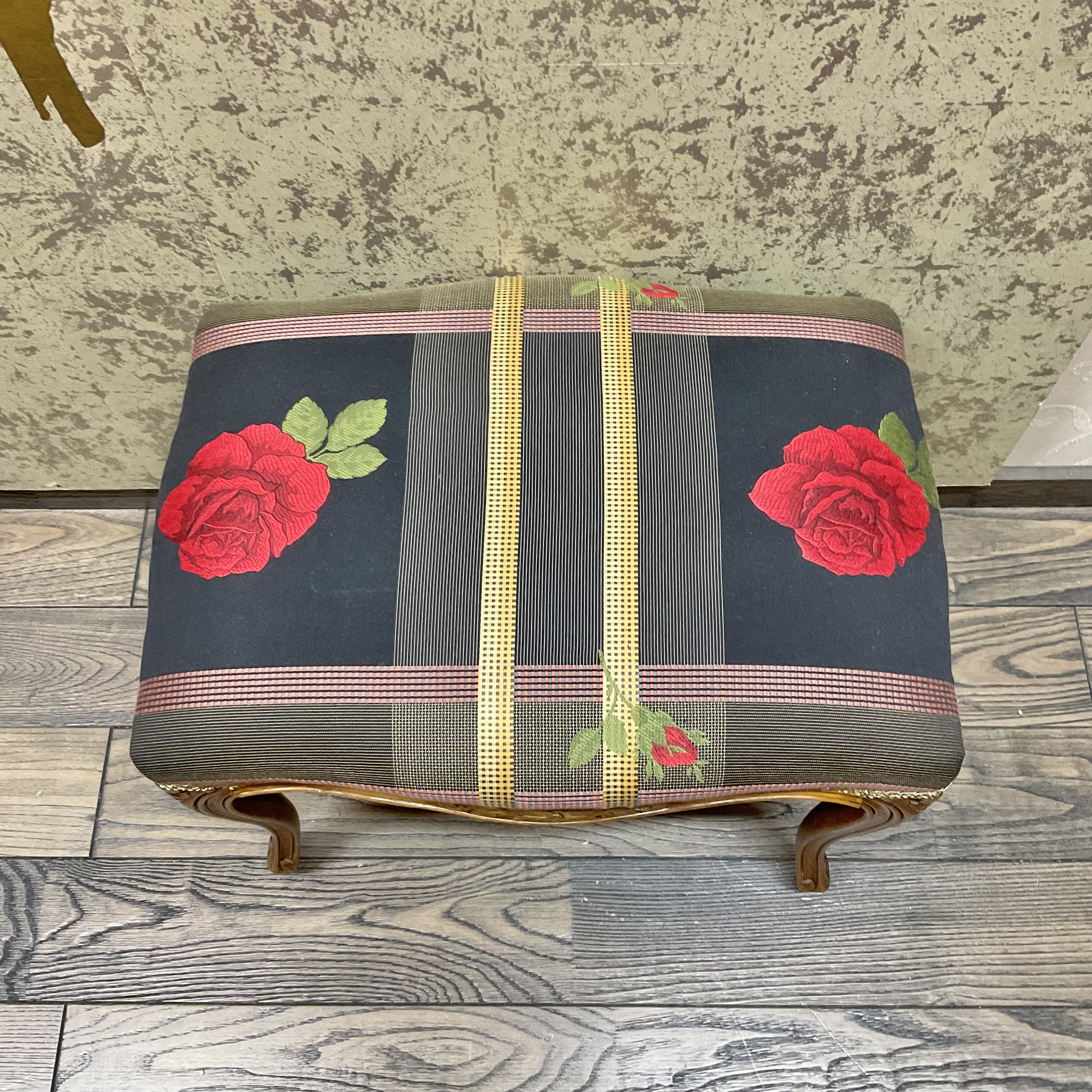側面の彫刻が美しいオットマン。生地は張り替え済みです。