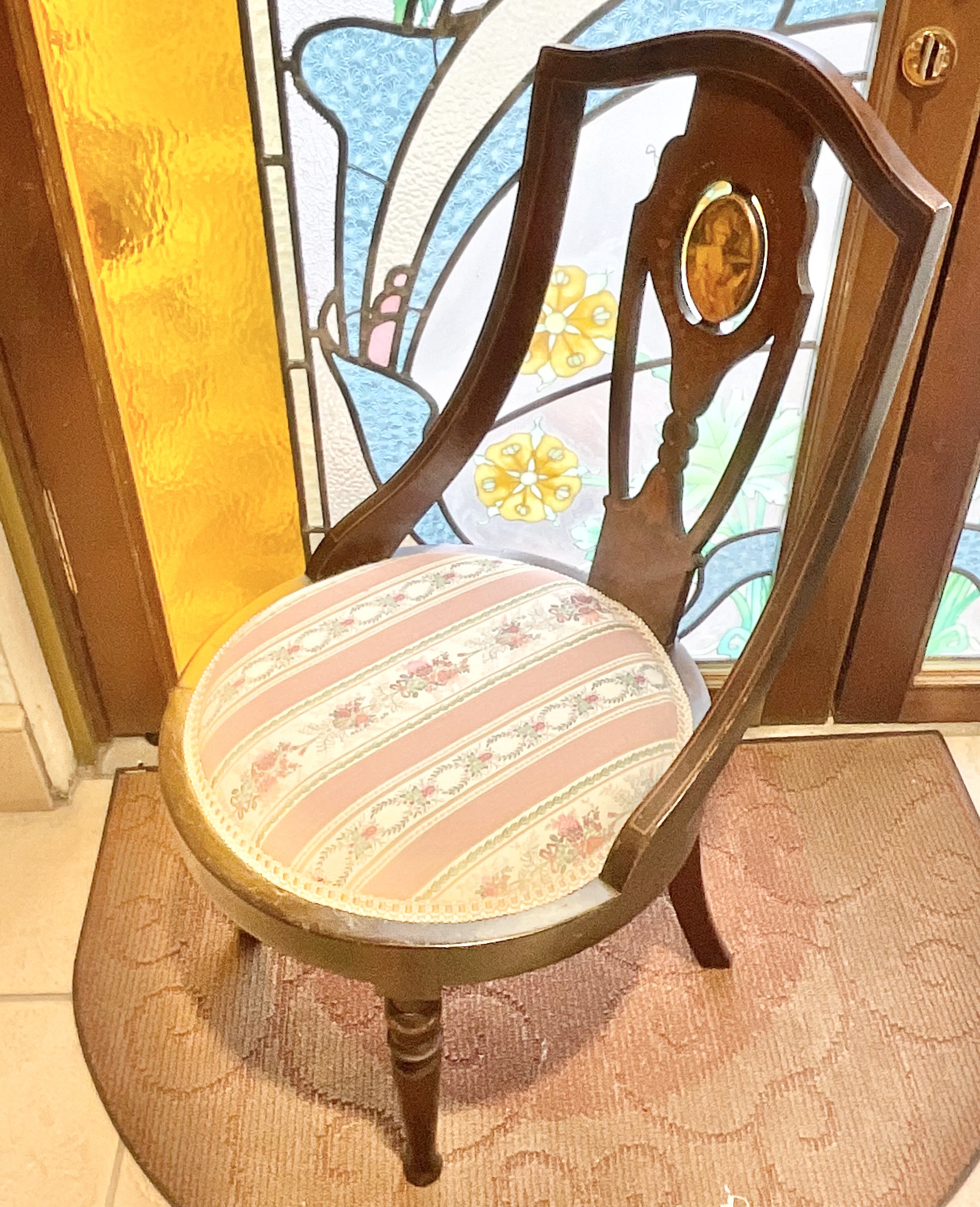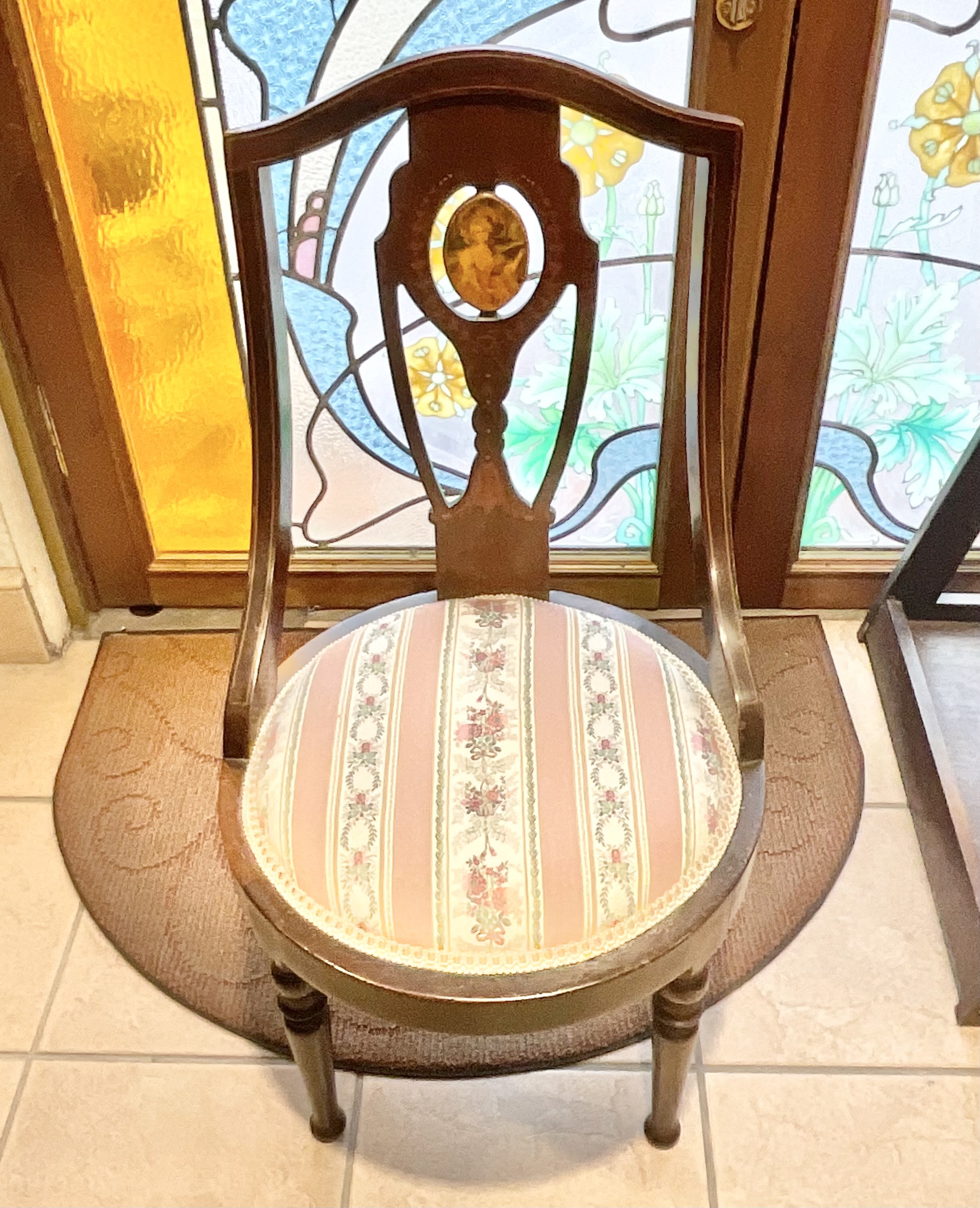 マリーアントワネットを彷彿とさせる貴婦人のイラストが入った優雅な椅子です。小さな椅子のため花瓶やドール置きにおすすめです。